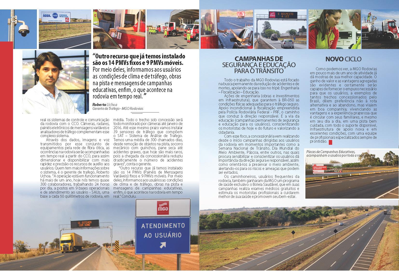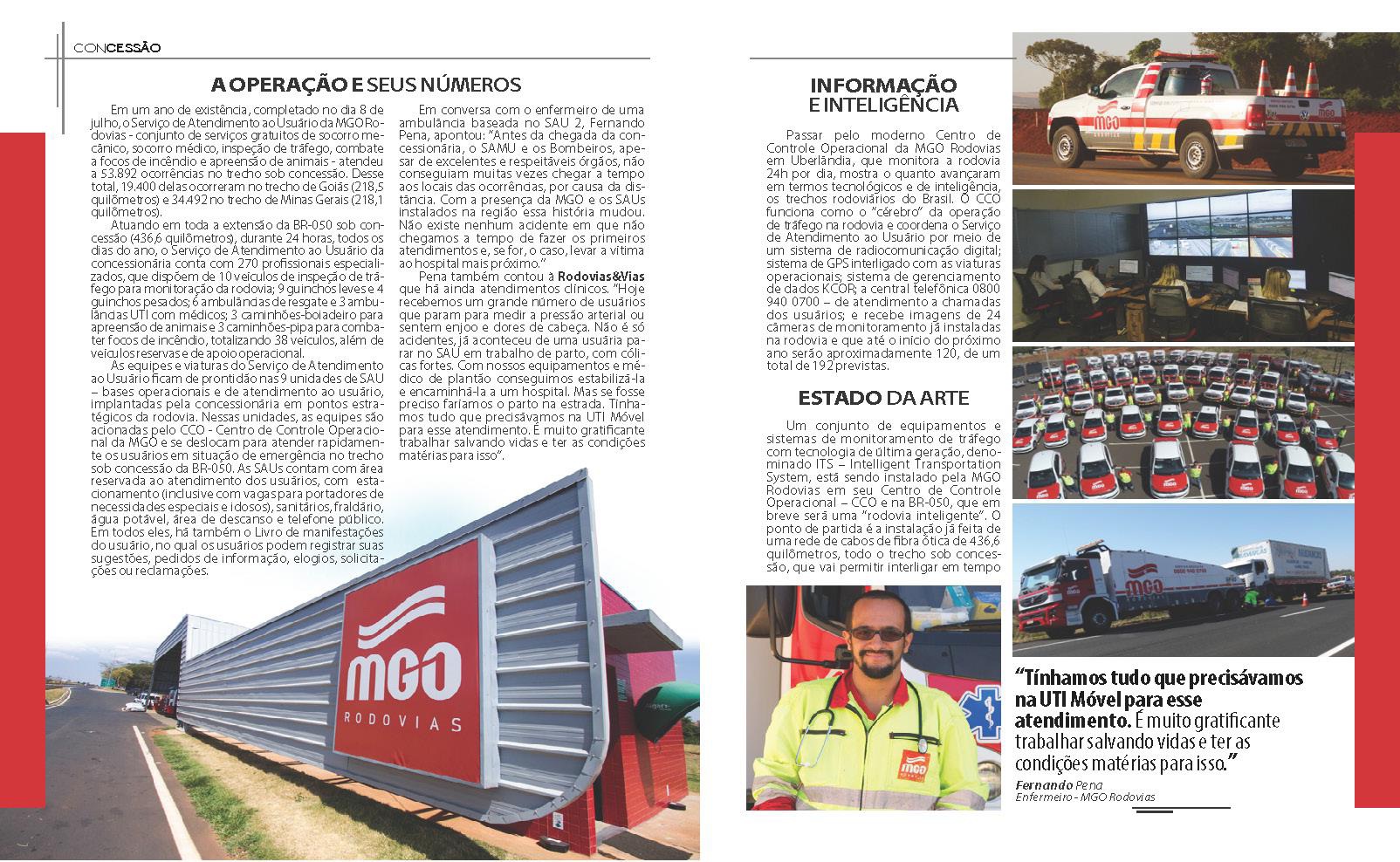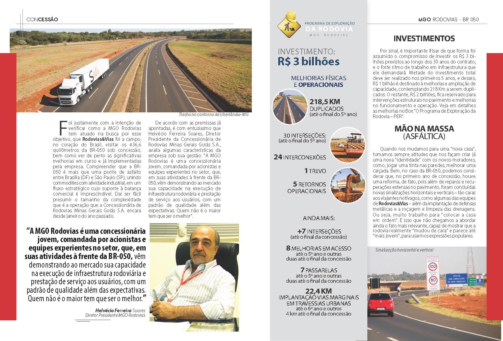 É portanto com entusiasmo que o Sr. Helvecio Ferreira Soares, Diretor Presidente da MGO Rodovias, avalia algumas características da empresa sob sua gestão: "A MGO Rodovias é uma empresa jovem, comandada por acionistas e equipes experientes no setor, que em suas atividades a frente da BR-050, vem demonstrando ao mercado sua capacidade na execução de infraestrutura rodoviária e prestação de serviço aos usuários, com um padrão de qualidade além das expectativas. Quem não é o maior tem que ser o melhor."