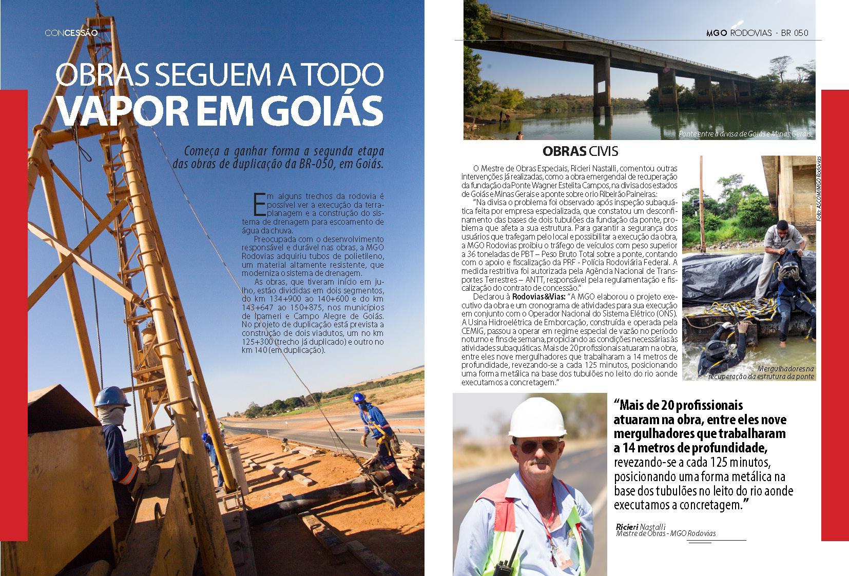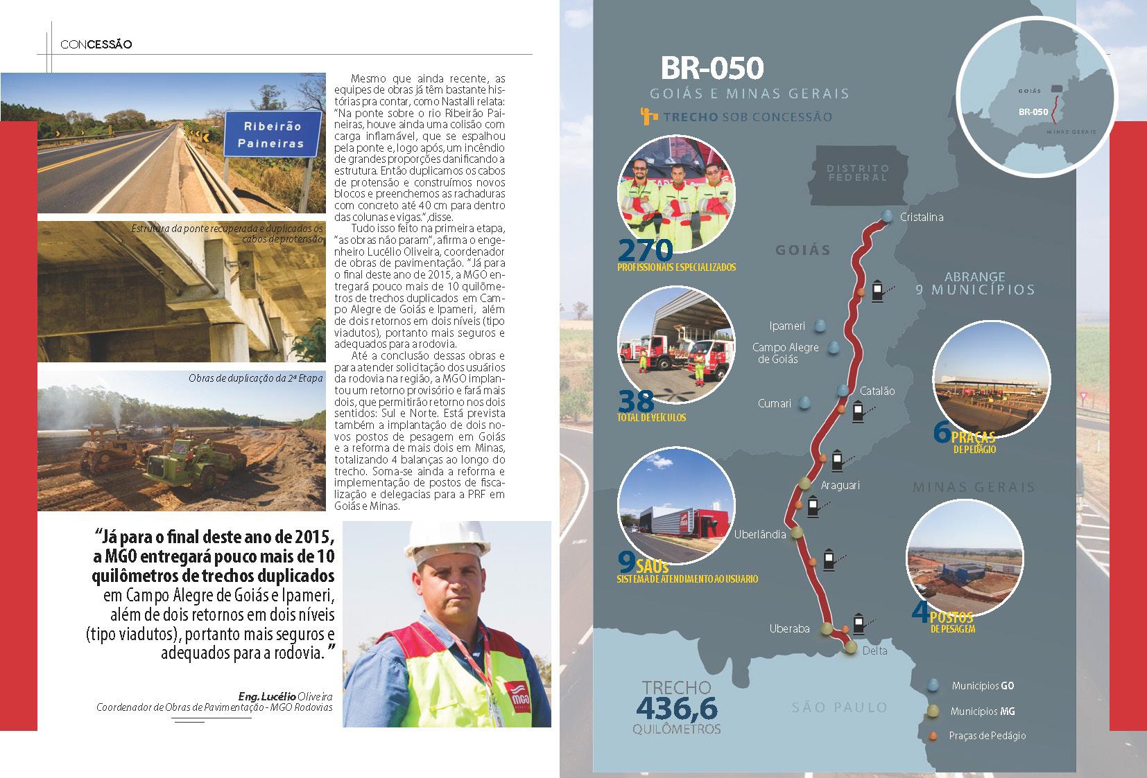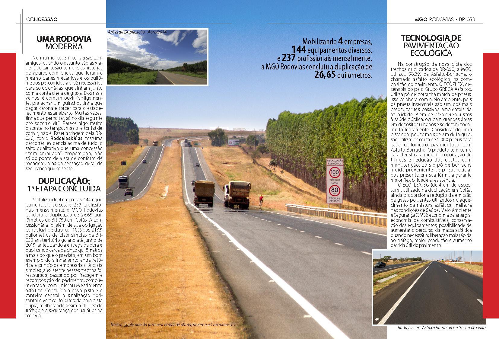 É portanto com entusiasmo que o Sr. Helvecio Ferreira Soares, Diretor Presidente da MGO Rodovias, avalia algumas características da empresa sob sua gestão: "A MGO Rodovias é uma empresa jovem, comandada por acionistas e equipes experientes no setor, que em suas atividades a frente da BR-050, vem demonstrando ao mercado sua capacidade na execução de infraestrutura rodoviária e prestação de serviço aos usuários, com um padrão de qualidade além das expectativas. Quem não é o maior tem que ser o melhor."